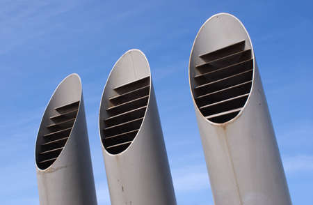 two gray metal industrial pipes fans in the window on the iron wall of the factory