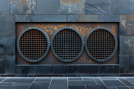 Industrial wall featuring three circular rusted metal grates set against a weathered blue tiled background. the juxtaposition of textures and colors highlights urban decay, making it ideal for themes of resilience, industrial design, and modern urban environments. Generative AI