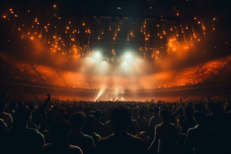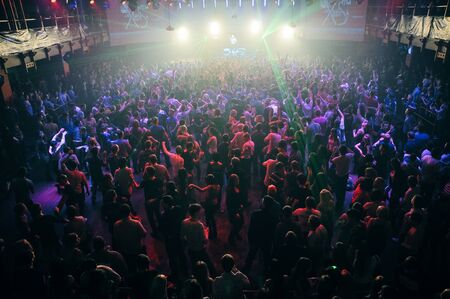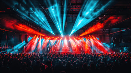 A crowded concert hall with scene stage lights, live show performance, with people silhouette, dance floor during a concert open-air festival