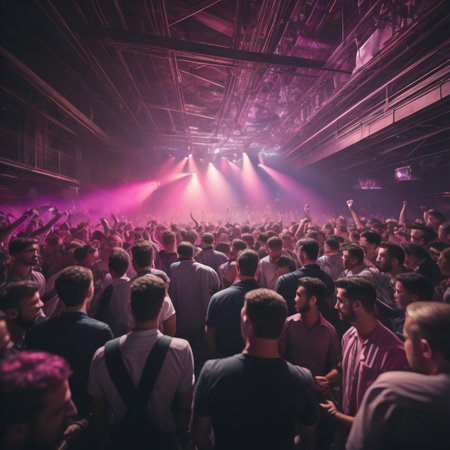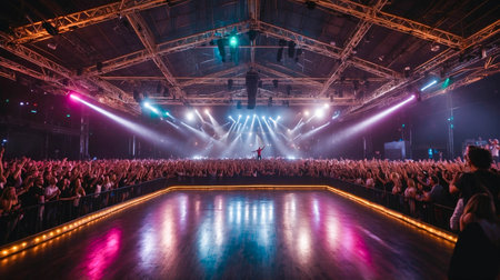 Top view of a hip-hop concert with vibrant stage effects and a lively audience.