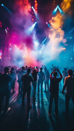 Concert crowd at a rock concert with bright stage lights and smoke