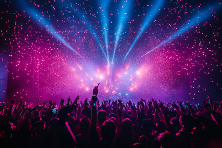 Energetic concert crowd celebrating under colorful confetti during an electrifying live performance at night