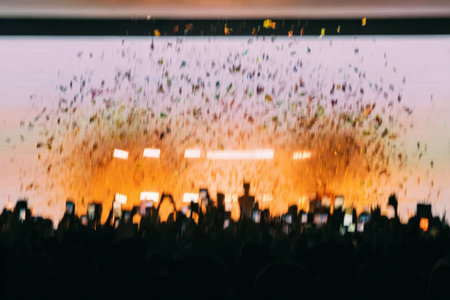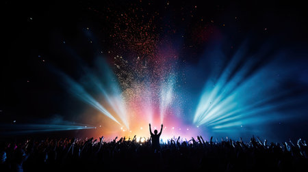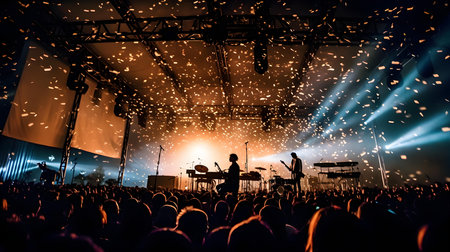 showing concert crowd cheering under a shower of gold confetti and dramatic stage lighting creating an energetic and celebratory atmosphere. resolution...