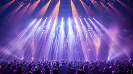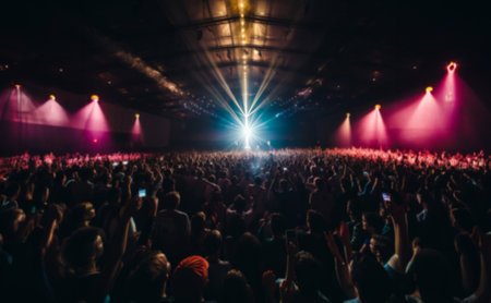 Stage lights and crowd of audience with hands raised at a music festival. Fans enjoying the party vibes.