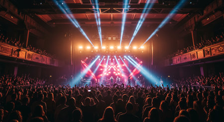 a vibrant concert scene with a rock band performing on stage under bright lights, surrounded by a large crowd of cheering fans in a packed venue hall