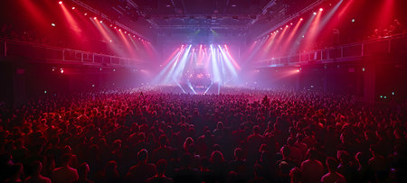 A crowded concert with scene stage lights in red tone