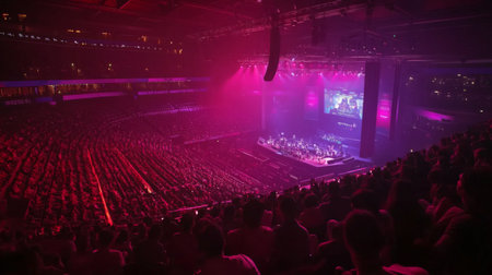 Large audience enjoying concert with vibrant lighting in spacious arena during the evening
