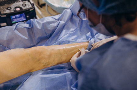 Process of varicose vein surgery in hospital, operating room, vein sealing, venous vascular surgery concept