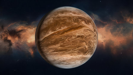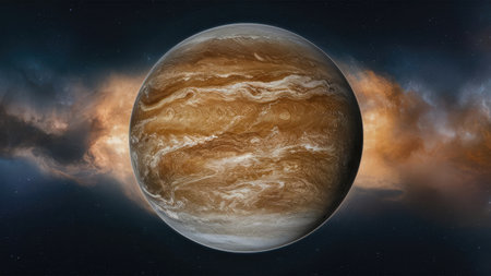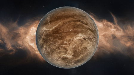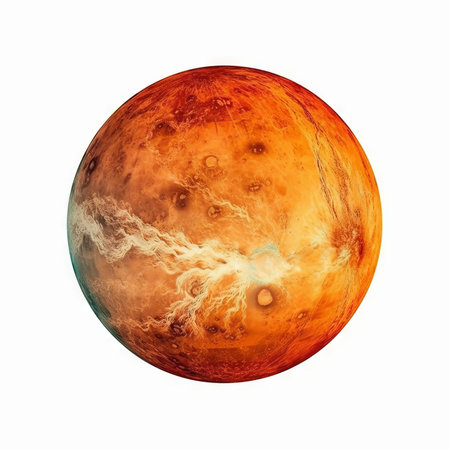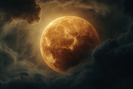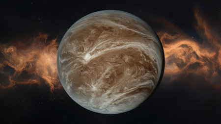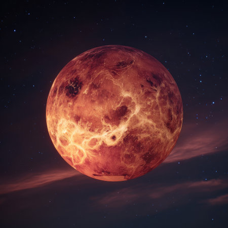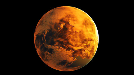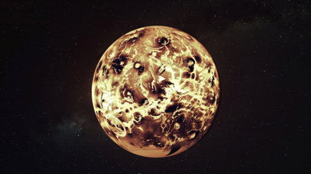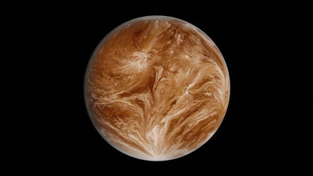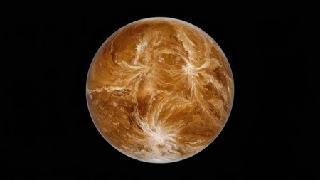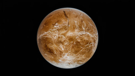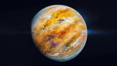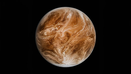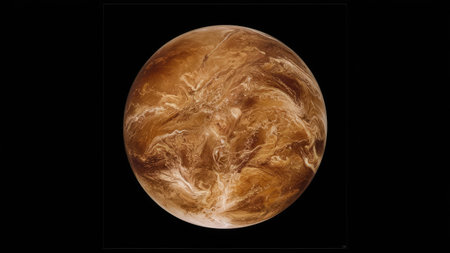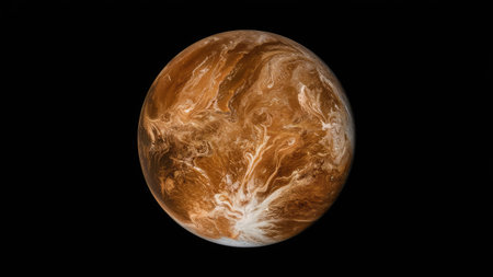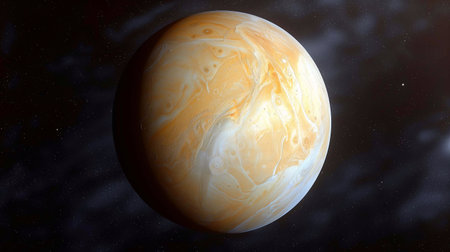 This celestial view highlights the distinct orange and yellow hues of Venus' thick atmosphere