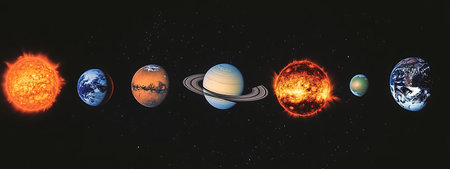 Illustration of the solar system planets aligned in a cosmic journey through space, showcasing the Sun, Mercury, Venus, Earth, Mars, Jupiter, Saturn, Uranus, and Neptune.