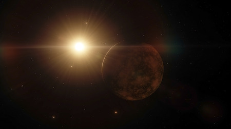 A red-orange planet in outer space with white stars and an orange sun in the distance.