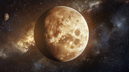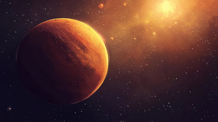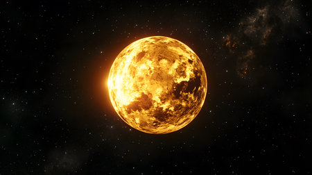Illuminated Golden Planet with Bright Light and Starry Cosmic Background