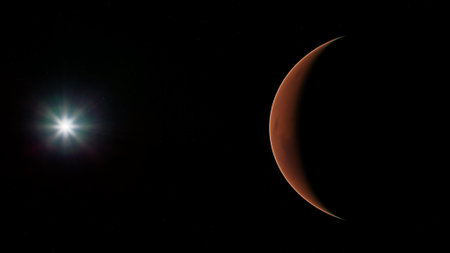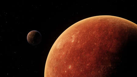 3D rendering of the Martian Orbit. Mars in space with illuminated craters and Martian mountains.