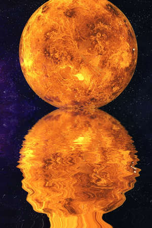 Beautiful unusual space planet in space reflected in water, galaxy stars night sky