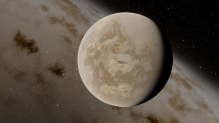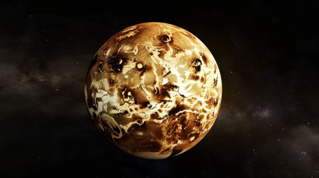 Solar System Concept. View of Full Big Planet Venus from Space on a black sky background.Venus surface without clouds. Title space on the right. Realistic 3D render of Venus and stars.Venus surface without clouds. Title space on the right. Realistic 3D render of Venus and stars.
