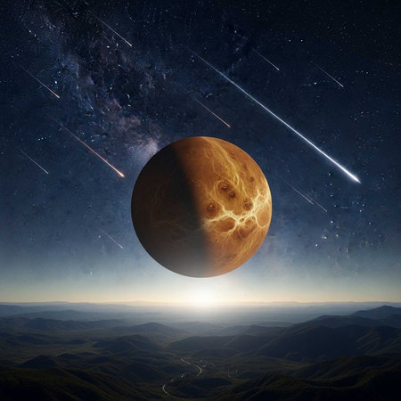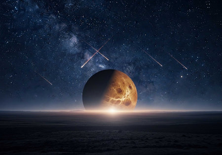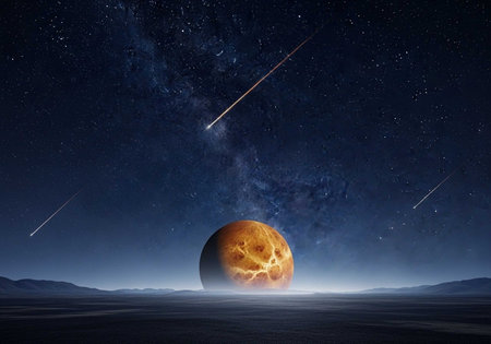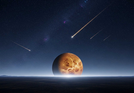 A stunning celestial scene with a large orange planet and shooting stars in a starry night sky