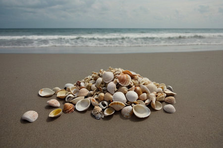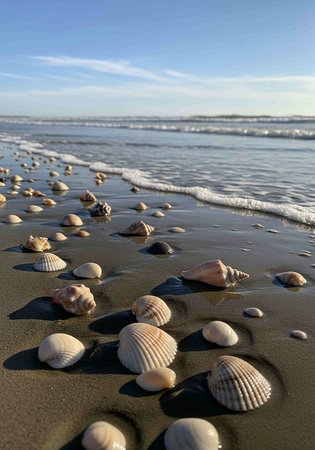 Seashells scattered on a serene beach with soft sand and gentle waves in the background, capturing the peaceful essence of a coastal environment. ideal for themes of relaxation, holidays, and natural beauty.