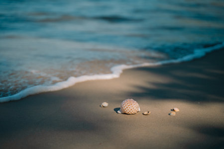A beautiful shell rests on the beach, kissed by gentle waves at sunrise. Captured in a serene landscape, the image conveys tranquility and the beauty of nature.