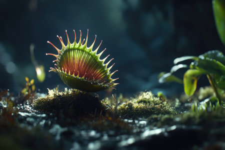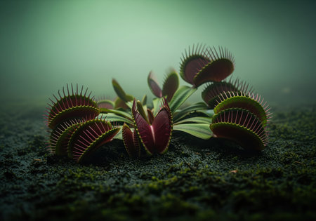 Venus flytraps with open and partially closed traps on a dark, wet mossy bog floor. the scene is illuminated by dramatic misty green light, highlighting the carnivorous plant predatory nature.