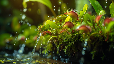 venus flytrap plants glisten with drops of water, as if sunrays are casting a dreamlike glow upon them. these fantasy creatures, captured in a photo on flickr, showcase a mesmerizing combination of light gold and red hues. the photo-realistic landscapes are brought to life with bold lines and vibrant colors, while the sparkling water reflections add an enchanting touch. ai generated