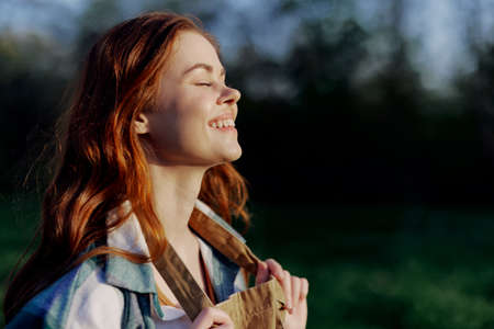 Portrait of a beautiful young woman with red hair in nature in a park in the summer, looking at the sunset against a background of green grass and trees