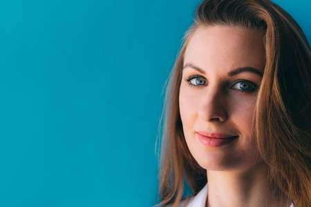Close-up portrait of beautiful young happy woman on blue background, with space for slogan or text. Nice makeup on face. Beauty. Skin care concept. Amazing girl with long hair and blue eyes