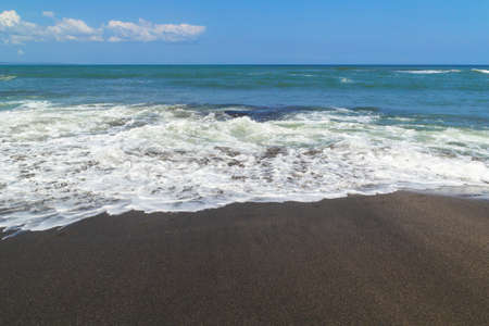 A wave laps the shore on a black sand beach in Bali, Indonesia. Black sand volcanic beach in Bali, Indonesia
