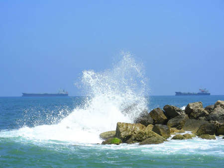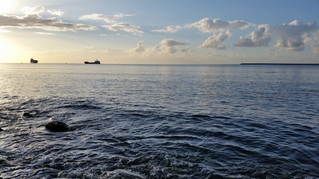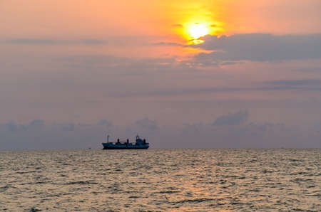 Nautical vessels in the horizon, evening seascape shot in Galle fort. Large cargo ships and small fishing boats.