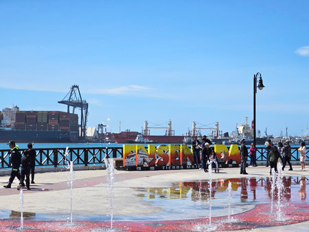 Ensenada, Baja California, Mexico - Mar 16 2025: Fountains where children play on the boardwalk in Ensenada, Baja California, overlooking cruise ships and merchant vessels