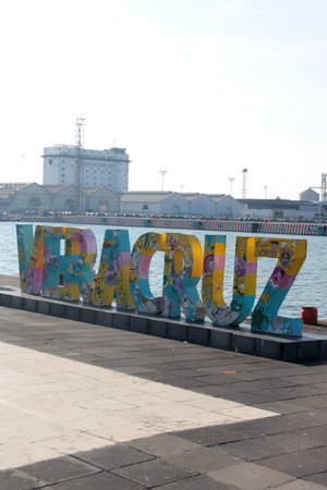 Veracruz, Mexico - Oct 26, 2025: Veracruz sign on the boardwalk of the commercial port with the sea in the background, cargo ship, and the San Juan de Ulua Fortress
