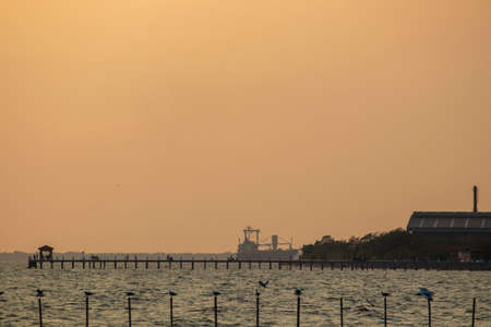 Beautiful sea and sky views after sunset with the reflection of the sun on the sea in the evening in Thailand.
