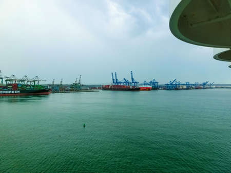 Fort Lauderdale - December 1, 2019: The view from a cruise ship of terminal at Port Everglades, in Ft. Lauderdale, Florida of the channel and beach.