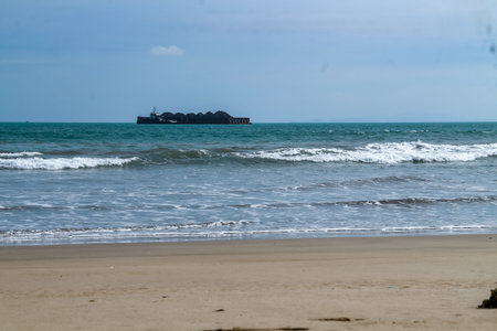 Beautiful view of the sea and the sandy beach with a ship in the distance