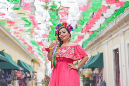 Street portrait of Mexican woman wearing traditional dress with multicolored embroidery. Hispanic woman celebrating independence day.