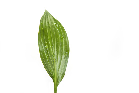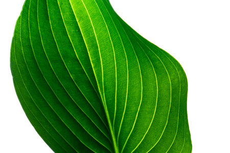 Beautiful big green leaf with vertical yellow vein stripes. Over white background.