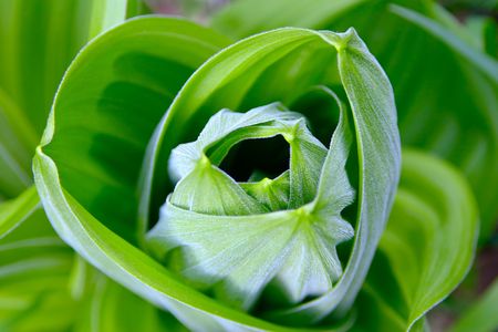 A plant of unusual shape in the forest. Green oval leaves in the grass. Beautiful relief surface of foliage.