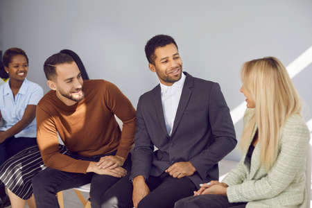 Variety of young colleagues have fun communicating with each other at business training. Multiracial workers discuss ideas during team building training session. People sit on chairs and talk.