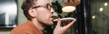 young man in glasses recording voice message on smartphone in cafe, banner