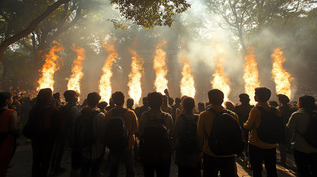 People raising hands in front of towering flames during a vibrant night celebration, generating a dramatic and energetic atmosphere filled with excitement and warmth
