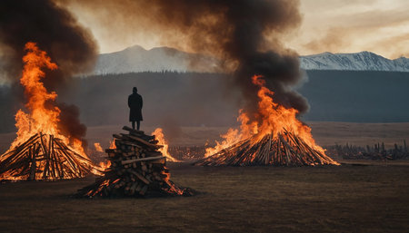Silhouette of person facing a raging fire