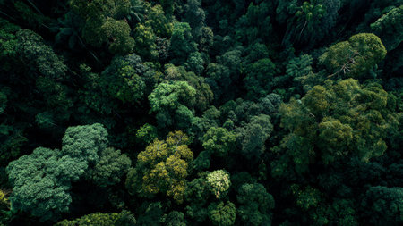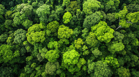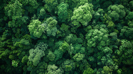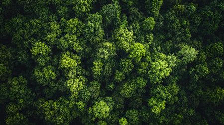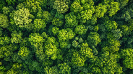Lush green forest canopy viewed from above, representing natural sustainability and conservation. Copy space.