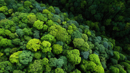 An aerial perspective showcases a vibrant forest canopy with diverse green hues and textured tree formations. Sunlight illuminates the composition. This image could be used for various purposes, including environmental, nature, or design projects. The overall impression is one of natural beauty and depth.