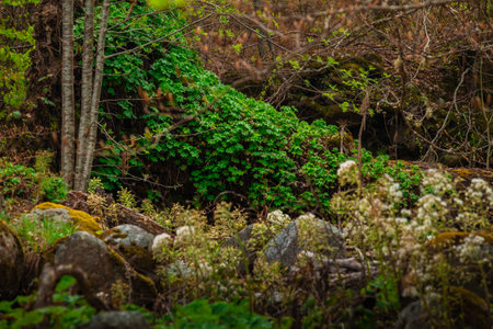 landscape of the undergrowth with ivy and leaves. High quality photo