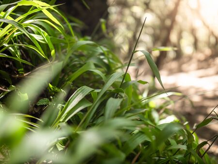 Closeup image of fresh green grass growing in the forest at bright sunny day
