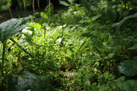 A cozy dark garden corner with green thickets of strawberries, aglaonema, and plantain, with a selective focus on the greenery and part of plant eaves, shallow depth of field