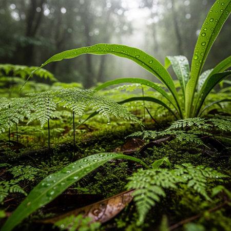A vibrant tapestry of lush green foliage, featuring ferns and broad-leaved plants in a dense natural setting.