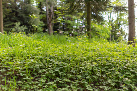 Creepy blurred background with ultra green grass from bottom or low angle view in light with blurry pine forest with copy space for text.