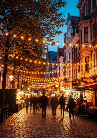A bustling cobblestone street at dusk with people walking under festive string lights in a charming European town
