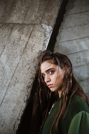Photo of attractive young woman standing and posing outdoors. Looking at camera.