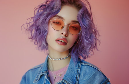 A woman with purple, curly hair is wearing round sunglasses and a denim jacket. She is standing in front of a pink background and looking directly at the camera.